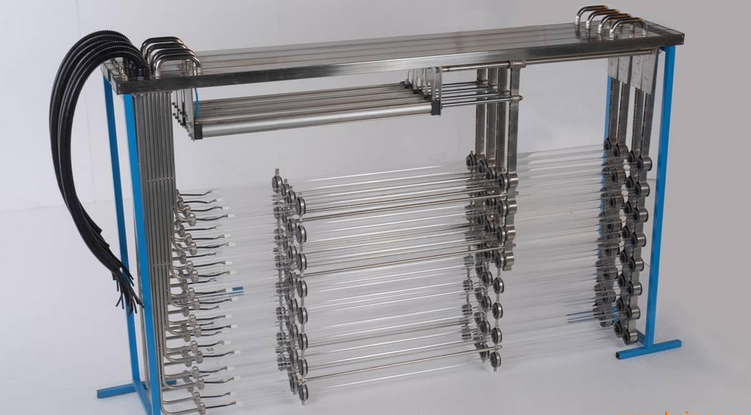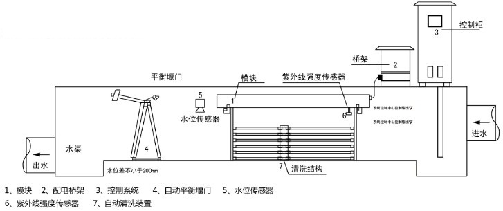 明渠式紫外線消毒器設(shè)備應(yīng)包括:紫外線燈模塊組,模塊支架,配電中心,系統(tǒng)控制中心,水位探測及控制輸出等組成。