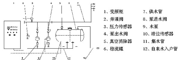 無(wú)負(fù)壓供水設(shè)備通過(guò)微機(jī)設(shè)定用戶所需的供水壓力,當(dāng)用戶的用水量增加,微機(jī)檢測(cè)到自來(lái)水的壓力低于用戶所需的用水壓力時(shí),微機(jī)會(huì)自動(dòng)控制變頻器啟動(dòng),管網(wǎng)壓力調(diào)節(jié)系統(tǒng)工作,直到使管網(wǎng)壓力增加到用戶所需的用水壓力時(shí),微機(jī)控制變頻器輸出一恒定的頻率,管網(wǎng)壓力調(diào)節(jié)系統(tǒng)以一恒定的壓力運(yùn)行,使用戶用水壓力恒定。